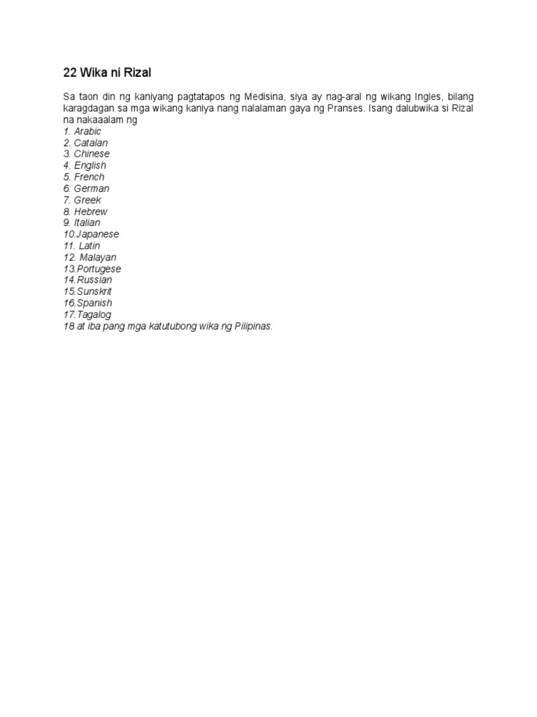 Jose Rizal ay may alam na dalawamput dalawang wika dahil siya ay may kakayahang magsalita ng mga ito. Sa katunayan umabot sa 200 ang mga liham na naisulat nila sa isat. Gamitin ang pamantayan sa pagsulat ng talambuhay.