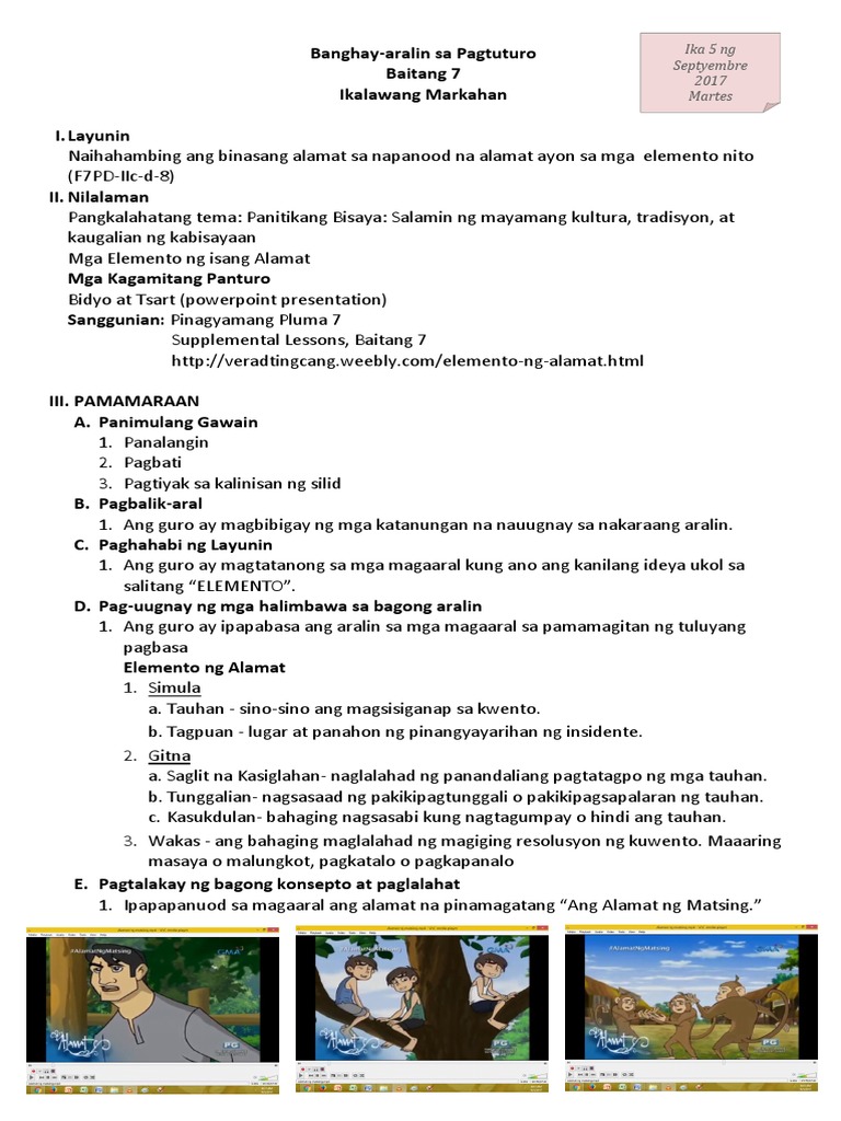 Banghay-Aralin sa Filipino 7 Banghay-Aralin sa Filipino 7 I. Si pagong at si matsing isang pabulaoctober 29 2008 rejimersina pagong at matsing ay matalik na magkaibigan. Muli siyang pumunta kay Matsing.