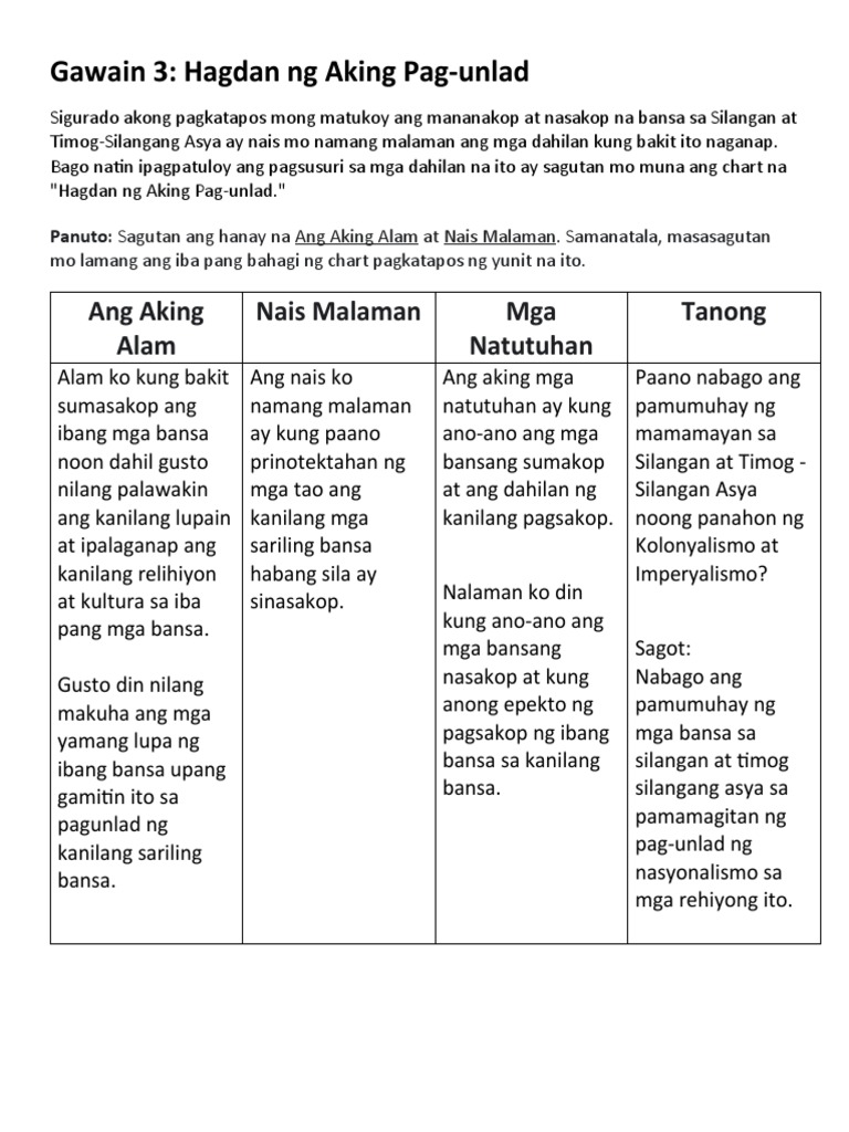 Hagdan ng Aking Pag-unlad Sigurado akong pagkatapos mong matukoy ang mananakop at nasakop na bansa sa Silangan at Timog Silangang Asya ay nais mo namang malaman ang mga dahilan kung bakit ito naganap. Isulatamang sagot sa iyong kuwadernobukás-loob ang pagtulong ni tia patron sa mga rebolusyonaryoagaw-pansin ang sigawan na mag-asawang nakasakay sa kalesa. Sukat ng Timog Silangang Asya.