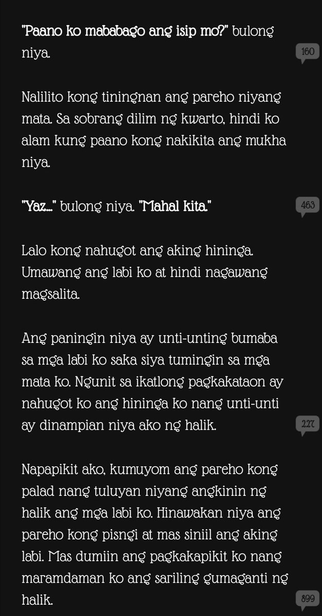 Mahal ka niya pag ginagawa niya lahat para sayo yun bang antok na antok na siya tapos ikaw gising na gising pa kasi gusto mong lambingin ka niya. Pero sana tama yang iyong kadahilanan kasi umaasa pa rin ako na baka bumalik ang tayo. Wag mong hintayin ang araw na sakit nalang ang nararamdaman mo at iniwan ka na ng kasiyahan mo.