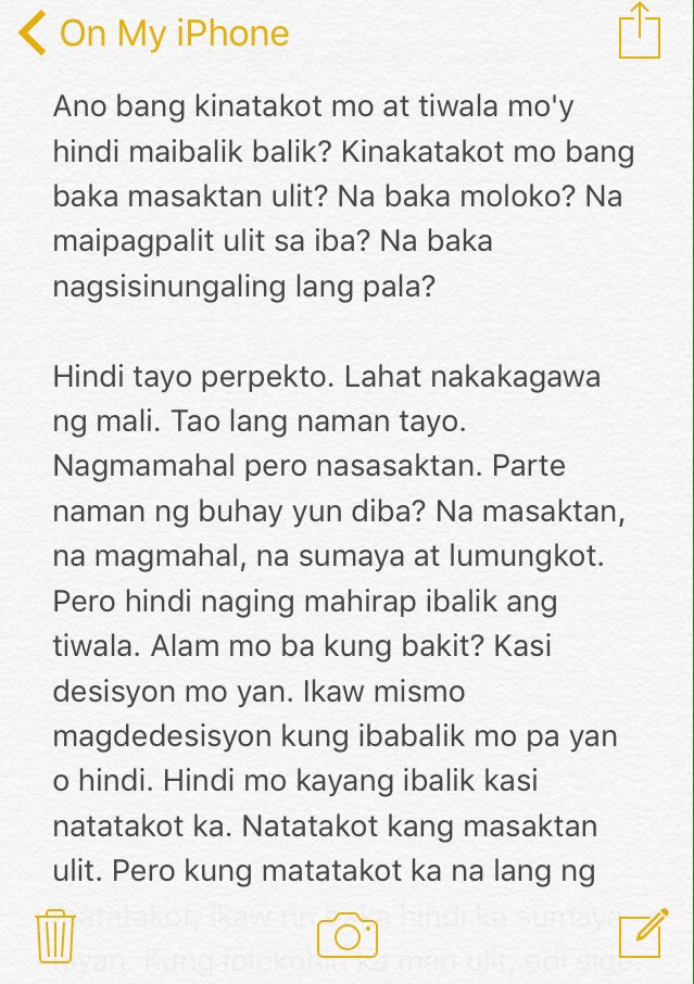 HINDI AKO TAMAD HINDI KO LANG ALAM KUNG SAN KO ILALAAN ANG AKING KASIPAGAN. Hindi ko alam kung anong nangyari samin yung biglang nawala lahat ng isang iglap. Gaano na ako ka-Pagod na pagod na isipin kung ok ka lang ba kung nakauwi ka na ba Baka natuyuan ka ng pawis sa kalalaro mo ng laro na magpapagod ka sa kahahabol sa bolang.